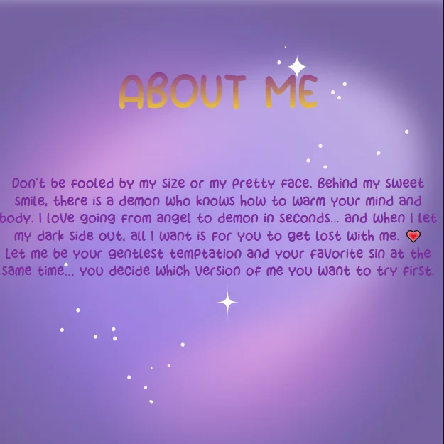 Don't be fooled by my size or my pretty face. Behind my sweet smile, there is a demon who knows how to warm your mind and body. I love going from angel to demon in seconds💗