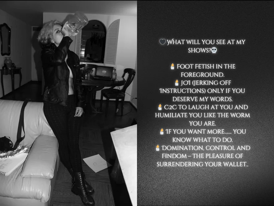 Erotic Dance, Ahegao, Fingering, Smoking, Tittyfuck, Yoga, Outdoor, Cooking, Spanking, Mistress, Dirty Talk, Humiliation, Masturbation, Role Play, Camel Toe, Cock Rating, Striptease, Foot Fetish, Deepthroat, Jerk-off Instruction, Blowjob, Nylon, Orgasm, Oil Show, Heels, Doggy Style